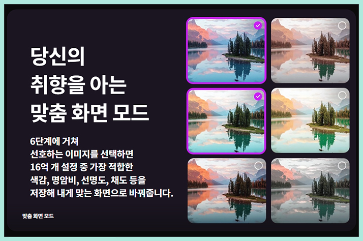 선호하는 이미지를 선택하면 16억 개 설정 중 가장 적합한 색감 명암비 선명도