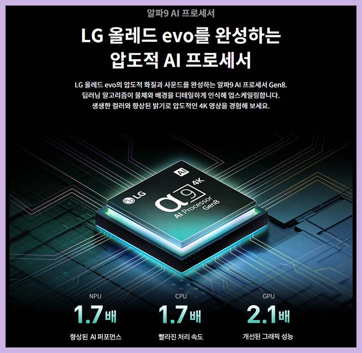 엘지 올레드 evo 77인치 티비 는 AI 프로세서를 탑재하여 영상의 노이즈는 줄이고