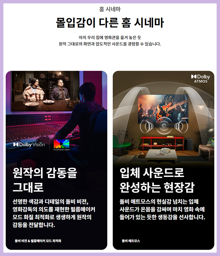 하는 똑똑한 영상 음향 최적화로 영화관에서 느꼇던 감동을 집에서도 경험할 수 있는