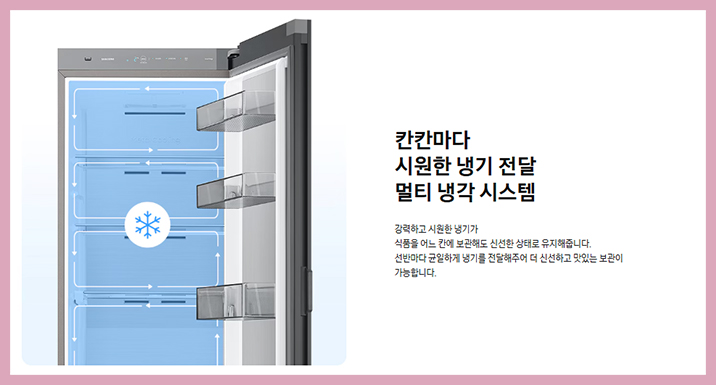 마다 냉기를 일정하게 공급해 주기 때문에 어떤 칸에 보관해도 식재료의 신선함