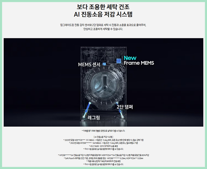 와 2단 댐퍼로 소음과 진동을 줄여 조용하게 세탁할 수 있어요