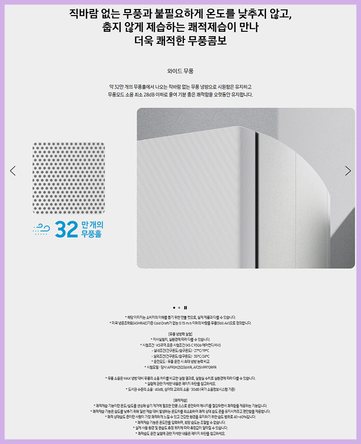 약 32만 개의 무풍홀을 배치하고 직바람 없는 무풍 냉방으로 시원함을